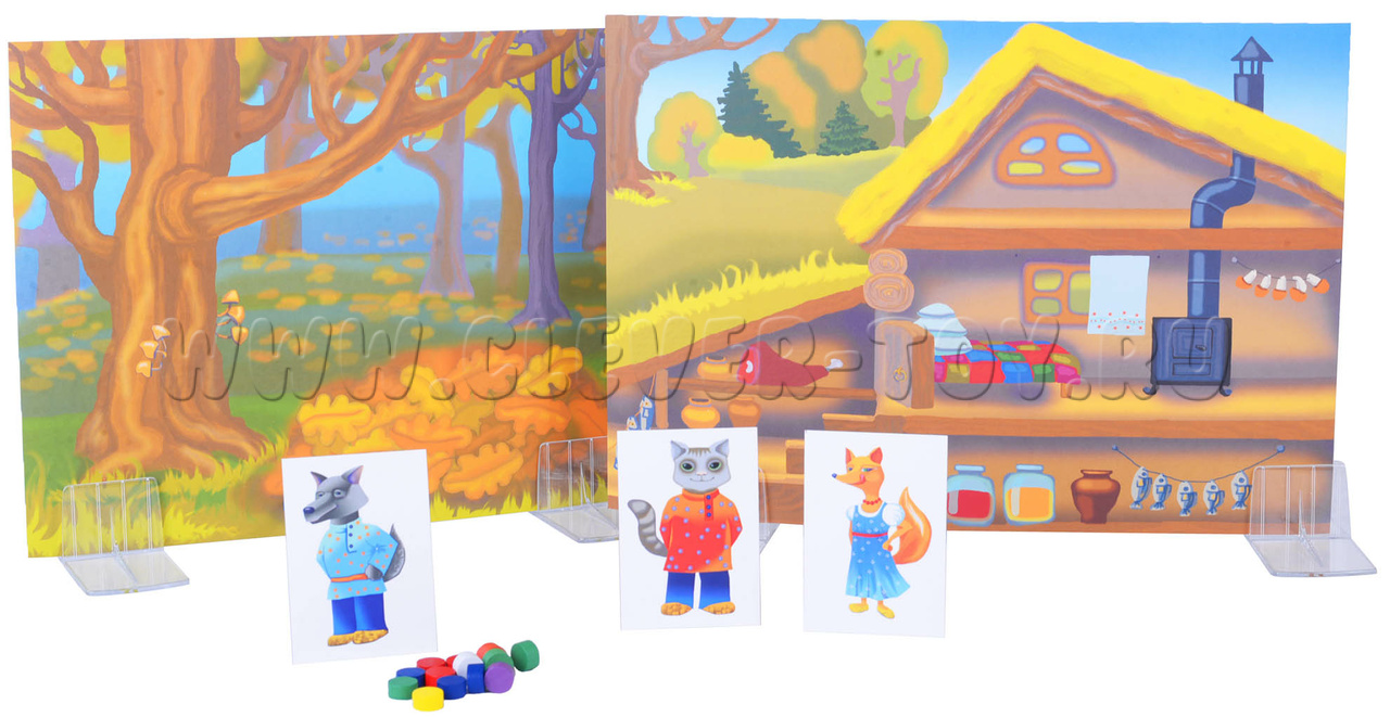 • карточки с персонажами формата 7*5 см – 8 шт. (котик, зайчик, волк, лиса, медведь, кабан, старик и старуха),