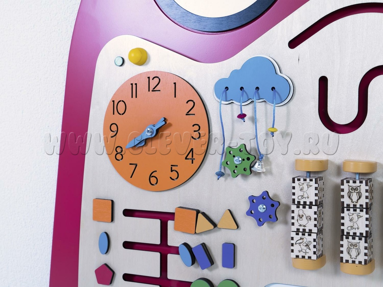 Бизиборд "Вит" предназначен для детских образовательных учреждений и помогает изучать геометрические фигуры (форму, количество углов, вид, цвет и особенности). Задания составлены по принципу "от простого к сложному". Например, при изучении геометрических фигур можно тренироваться в счёте, определяя количество углов. Также можно рисовать запомнившиеся фигуры или играть в крестики-нолики, вращая фигуры.