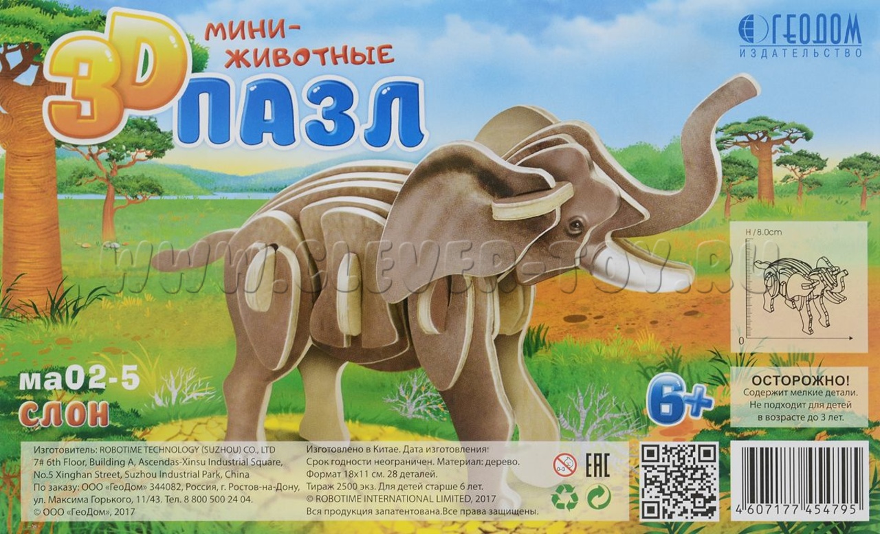 Пазл деревянный 3D. Слон. Серия Мини-животные. Размер 11,5х18,5 см.
