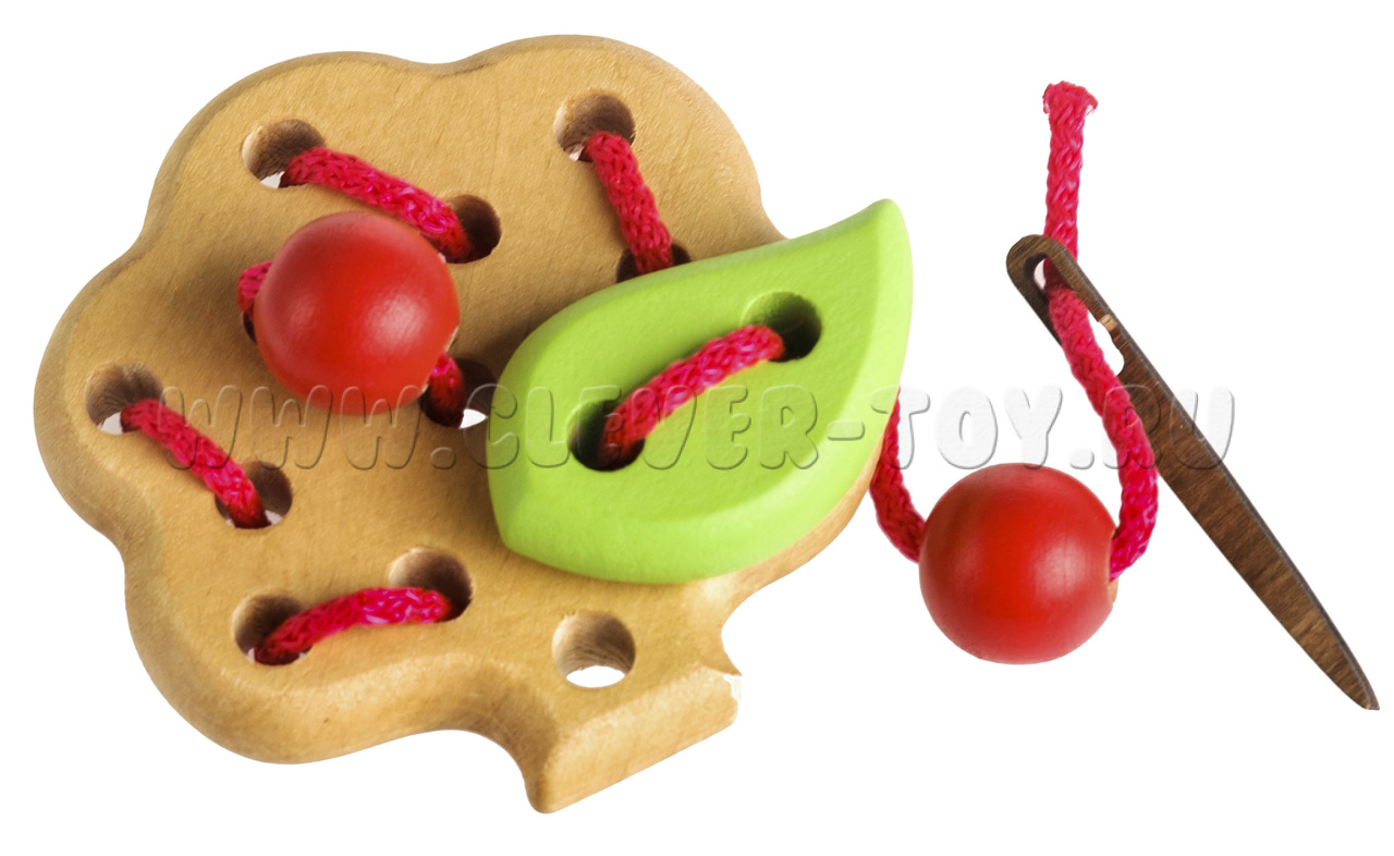 Состоит из иголки, шнурка, лепестка, 2 яблочек и яблони с 13 отверстиями.