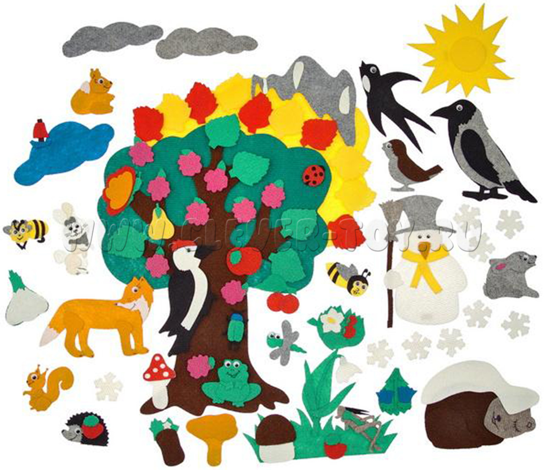 - растения – груша, яблоко, клубника, шиповник, крона жёлтая, крона зелёная, ствол дерева, листочки зелёные, красные, жёлтые, цветочки – 10 шт.;