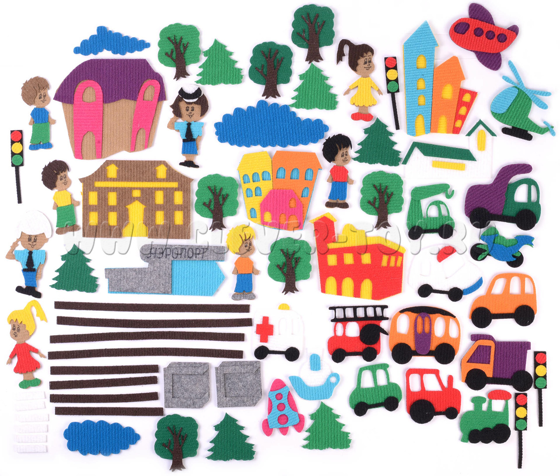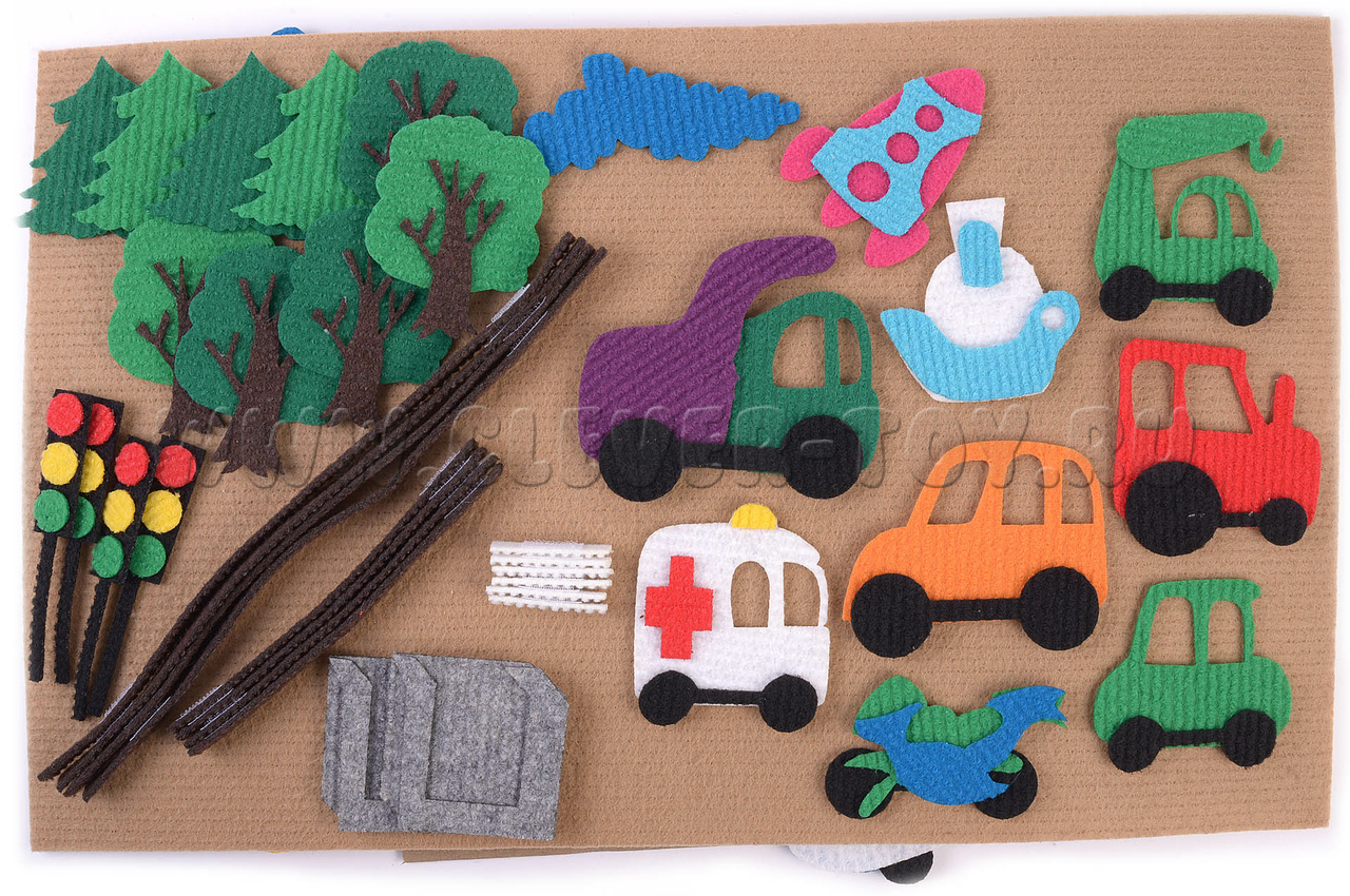 • самый разнообразный транспорт - самолёт, вертолёт, корабль, грузовик, автомобиль - 3 шт., трактор, локомотив, самосвал, автобус, скорая помощь, грузовик с краном, ракета;