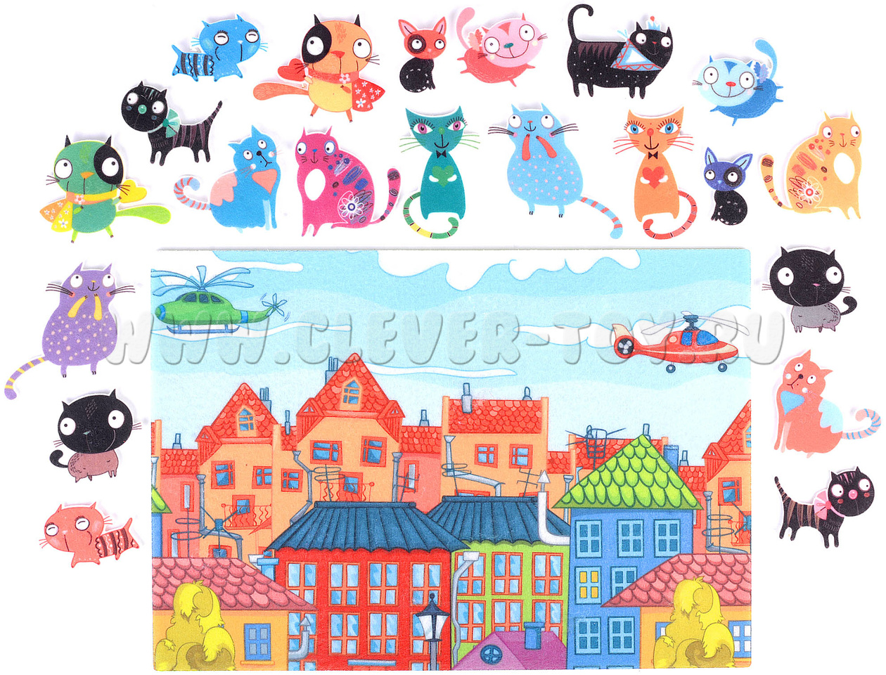 В ярком городке с цветными домиками живёт множество забавных котов, кошек и котят: