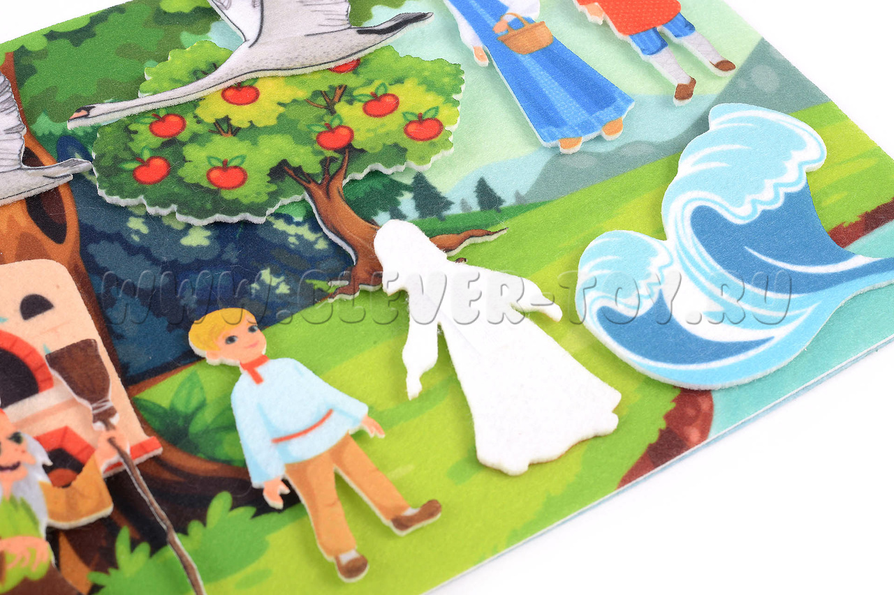 Детское игровое пособие познакомит ребенка со сказкой "Гуси лебеди". Выполнено из фетра по типу кукольного театра и подойдет для театральных, дидактических и сюжетных игр. Фигурки легко прилипают и отлипают, не мнутся и не рвутся в процессе игры.
