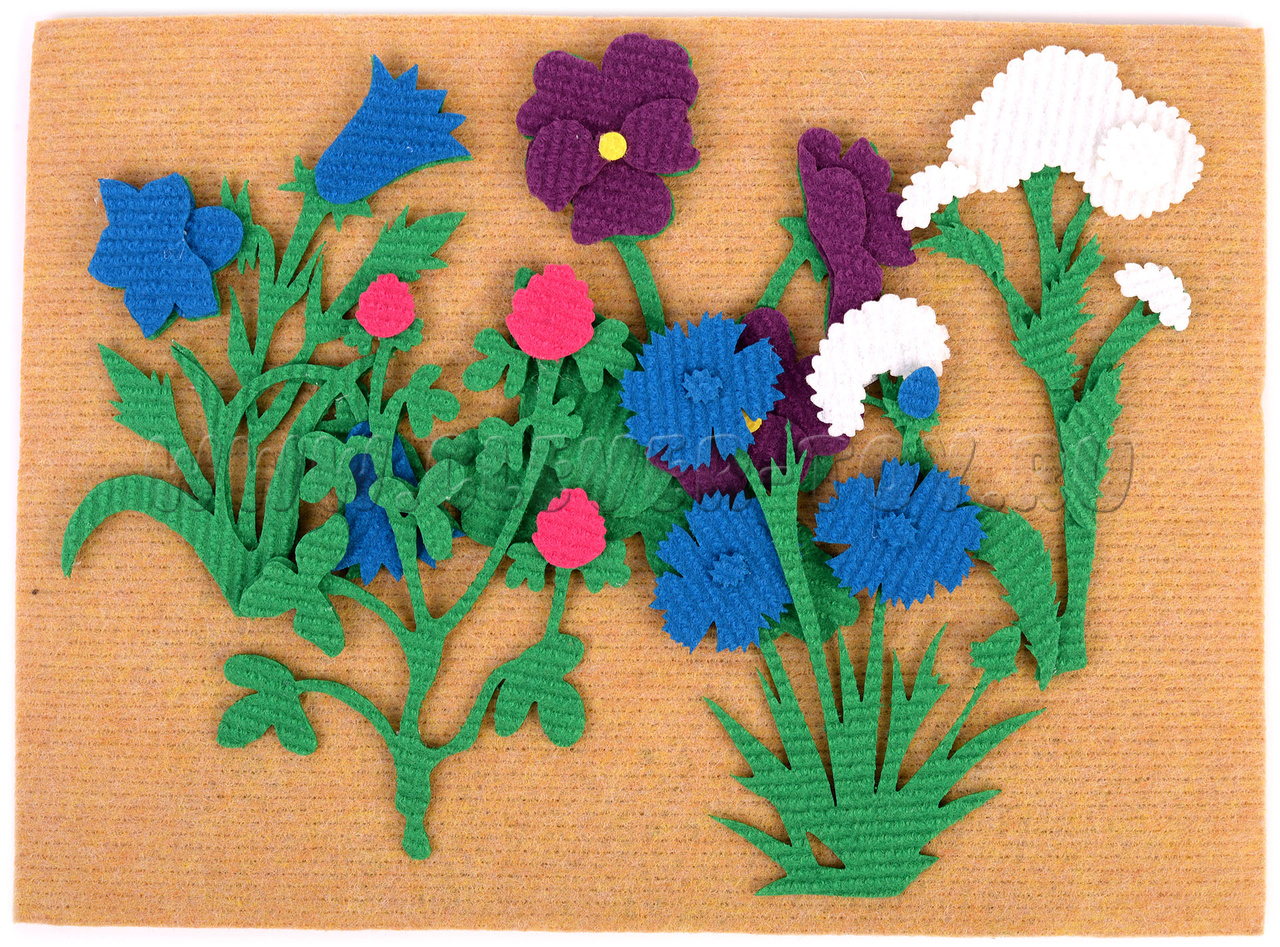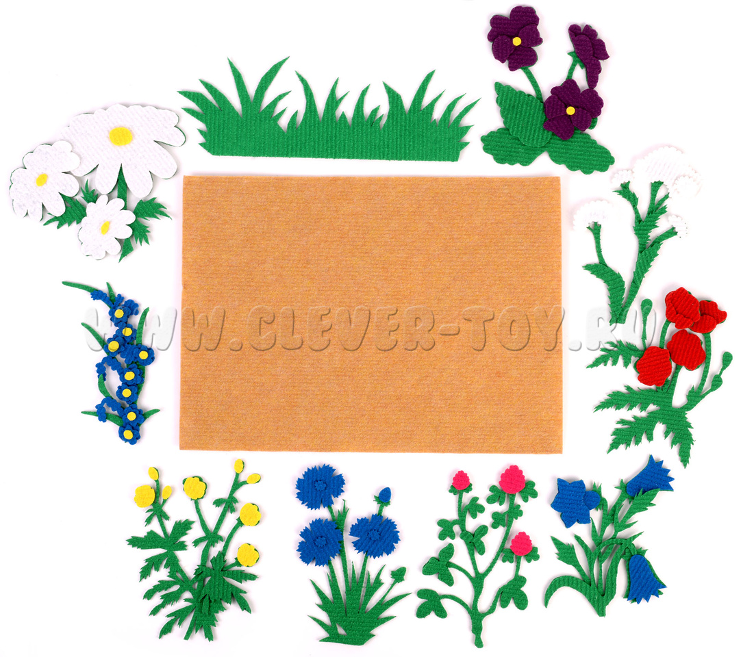 • 8 разнообразных видов луговых цветов, в том числе: мак, колокольчик, ромашка, василёк, лютики, фиалки вместе со стеблями, листьями и травой;