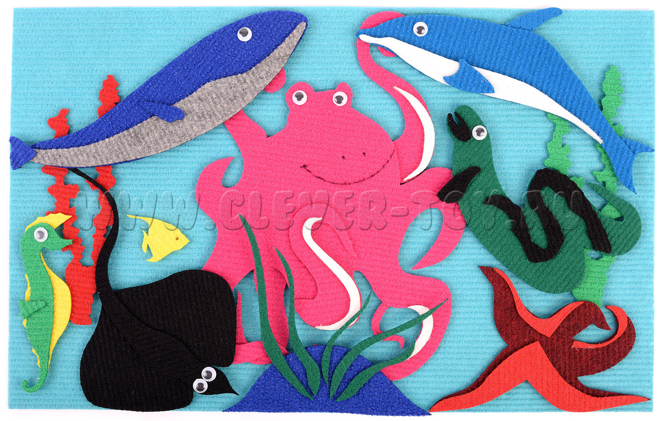 - обитатели моря: осьминог, касатка, морской котик, тюлень, кит, акула, скат, медуза, морской конёк, дельфин, мурена, морская звезда, рыбка;