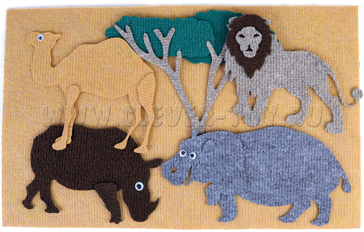 • Животные – зебра, лев, тигр, слон, жираф, обезьяна, павлин, крокодил, змея, черепаха, бегемот, носорог, фламинго, попугай.