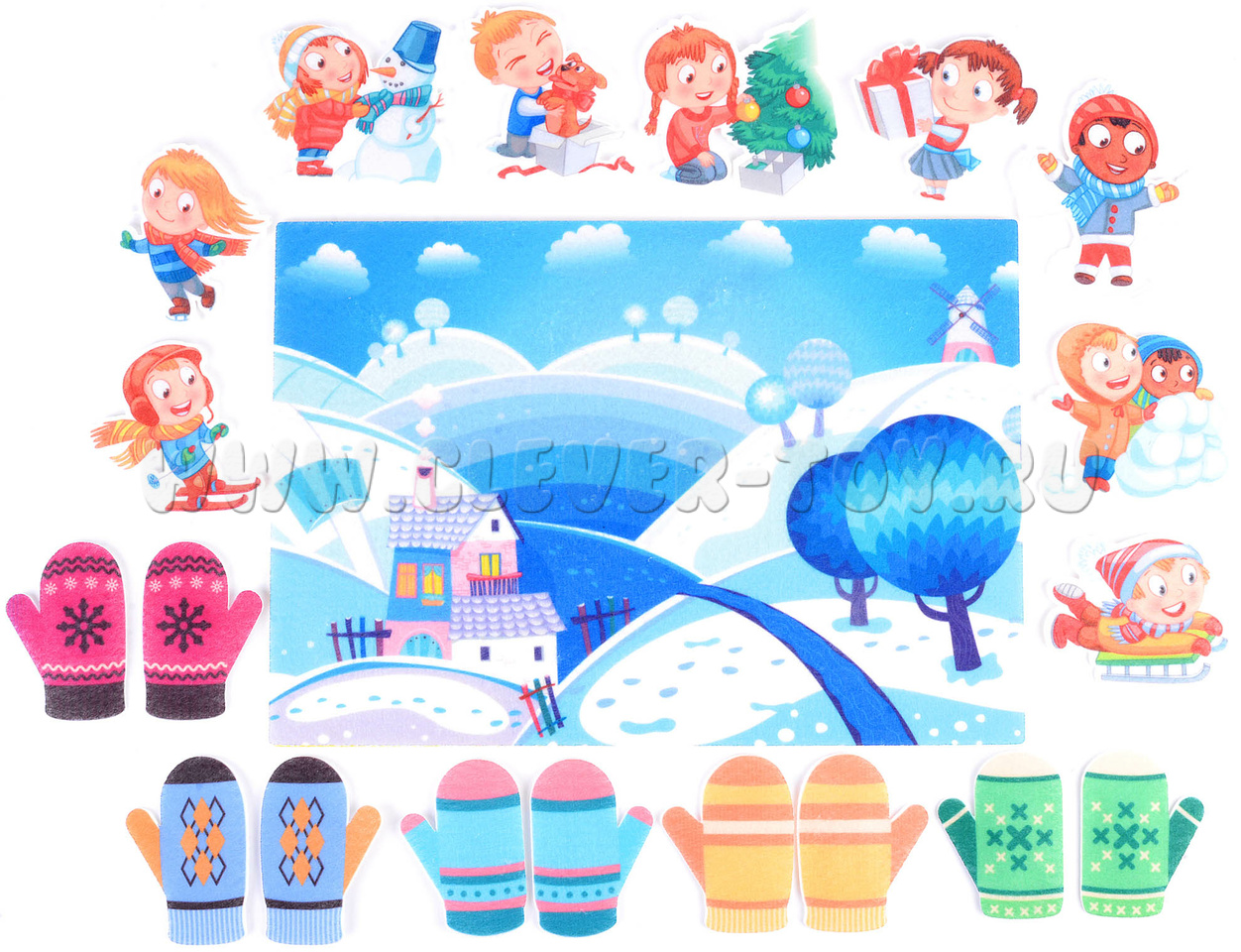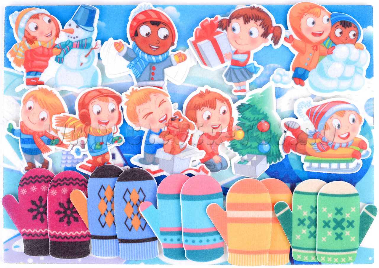 Перемещая по полю персонажей аппликации, малыш, играючи, узнает, как весело проводить время зимой: лепить снеговика, кататься на санках, наряжать елку и т.д. Можно пойти еще дальше: дать героям имена и познакомить их друг с другом.