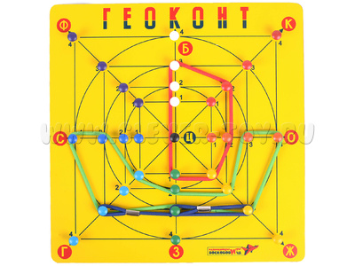 В игре "Геоконт" согласно определенным заданиям, ребенок натягивает резинки на гвоздики таким образом, что создает различные силуэты, геометрические фигуры, узоры, цифры, буквы - по образцу, словесному алгоритму или собственному замыслу.