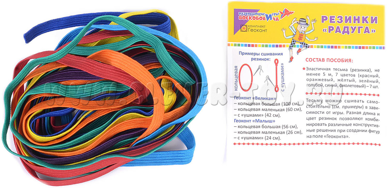 Описание продукта. Набор цветных резинок - это увлекательное дополнение к игровой системе "Геоконт", которое открывает безграничные возможности для детского творчества. Удобные эластичные элементы можно легко преобразовать в кольцевые формы или резинки с петлями, что делает игру ещё более интересной и разнообразной.