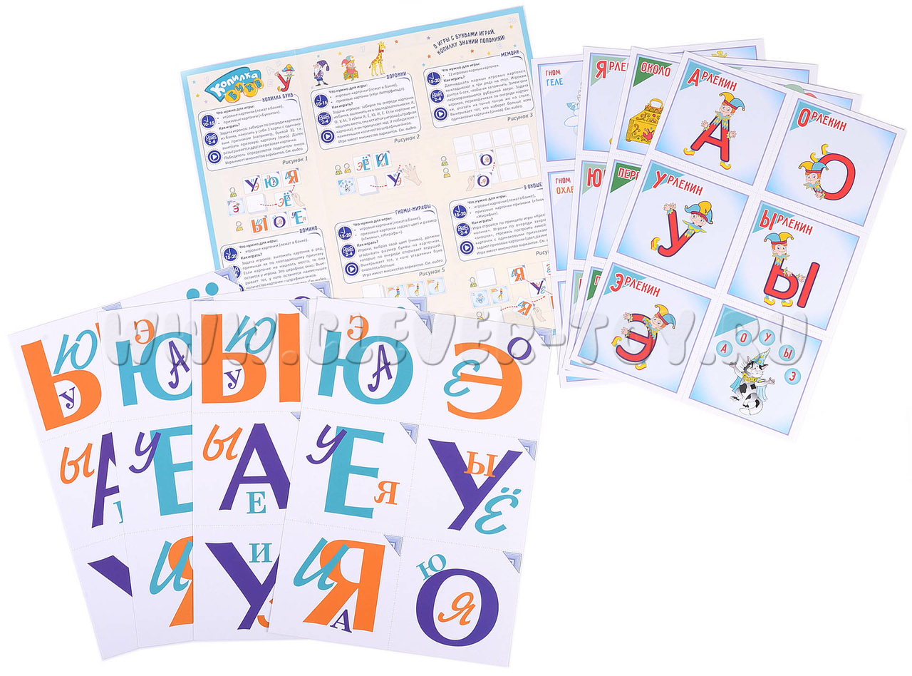 1. 48 картонных карточек (100х100мм): 24 игровых с гласными буквами, 24 призовых, обозначающих цвет, размер, положение (предлоги); цветная инструкция с правилами игр;