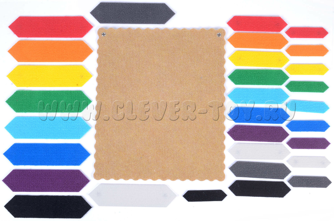• три набора по 10 разноцветных односторонних палочек (радужные цвета + белый, серый, чёрный), палочки отличаются по величине (маленькие – 10 см., средние 14 см., большие 20 см.);