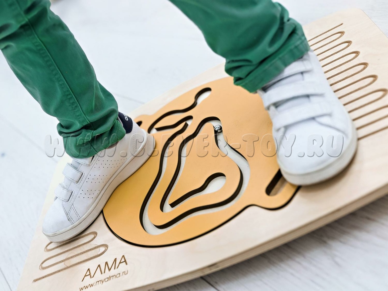 Игровой нейротренажёр предназначен для улучшения координации движений, развития внимания и логического мышления. Он состоит из балансира для ног и четырёх лабиринтов-балансиров для рук, которые вставляются в специальное углубление на ножном балансире.