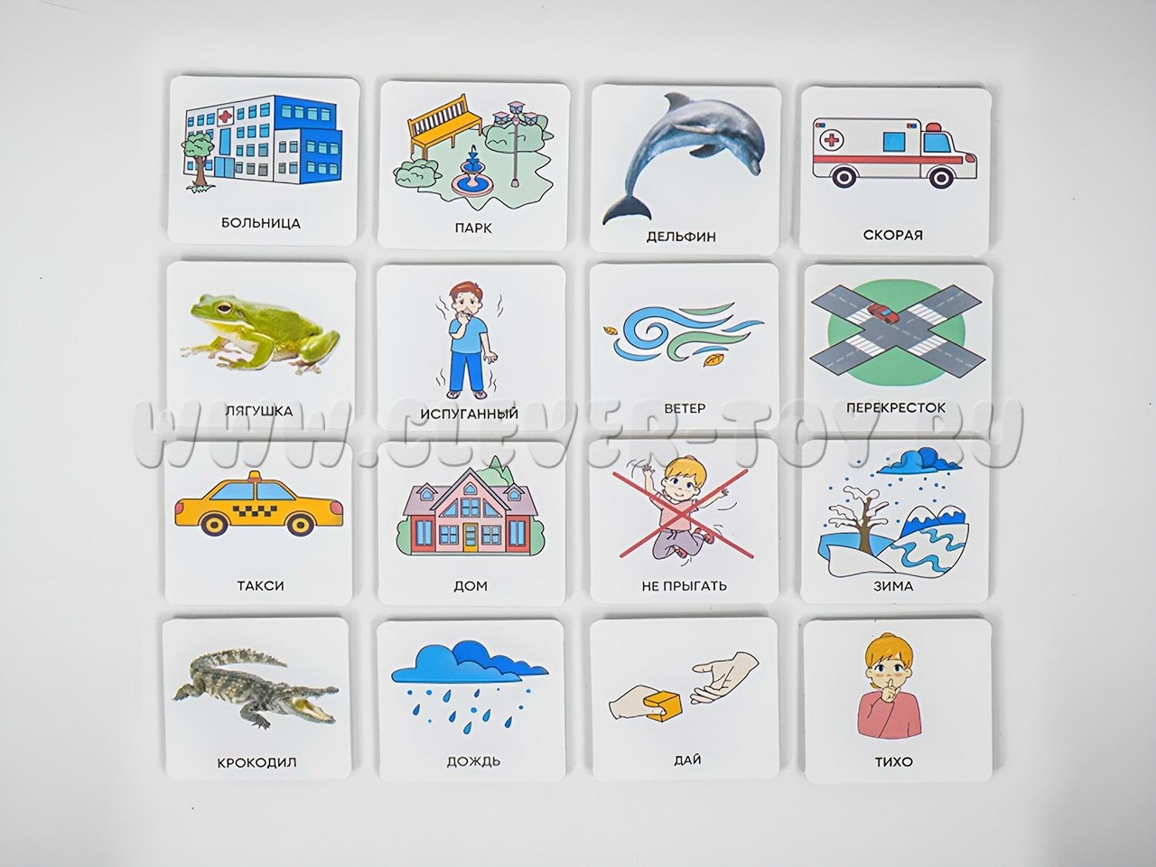 - Категории карточек в наборе: одеваюсь, игрушки, поликлиника, дом, ягоды и фрукты, еда, улица, действия, что нельзя делать, школа, состояние человека, детская площадка, части тела, питомцы, животные, поощрения.