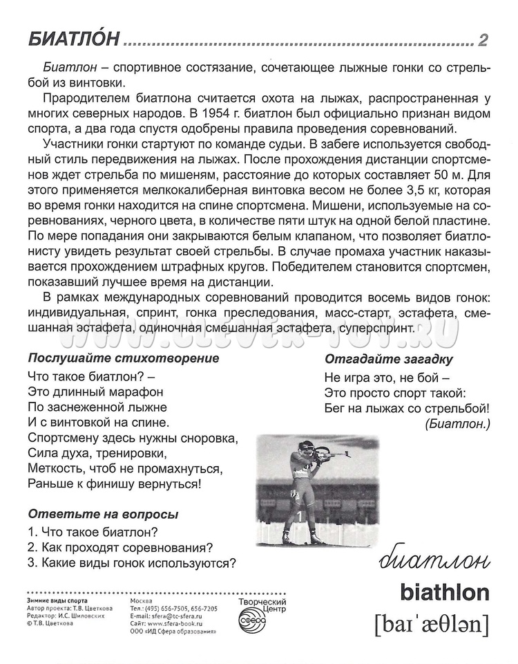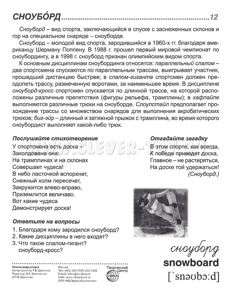 На лицевой стороне каждой карточки дается цветное изображение зимнего вида спорта, на обратной - подробное описание, из которого дети узнают много интересного и даже поучительного! Для лучшего закрепления материала представлены оригинальные