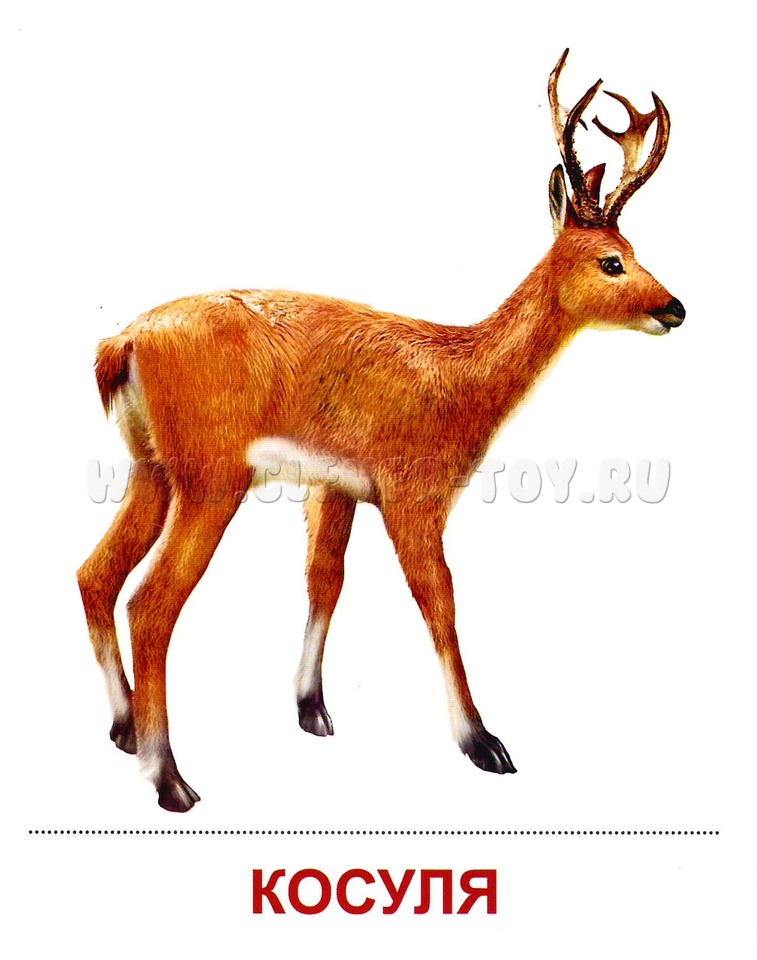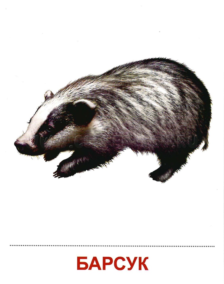 Состав комплекта (16 карточек): Барсук, Белка, Бобр, Бурундук, Волк, Выдра, Горностай, Горный баран, Дикая свинья, Ёж, Заяц, Змея, Зубр, Косуля, Крот, Куница
