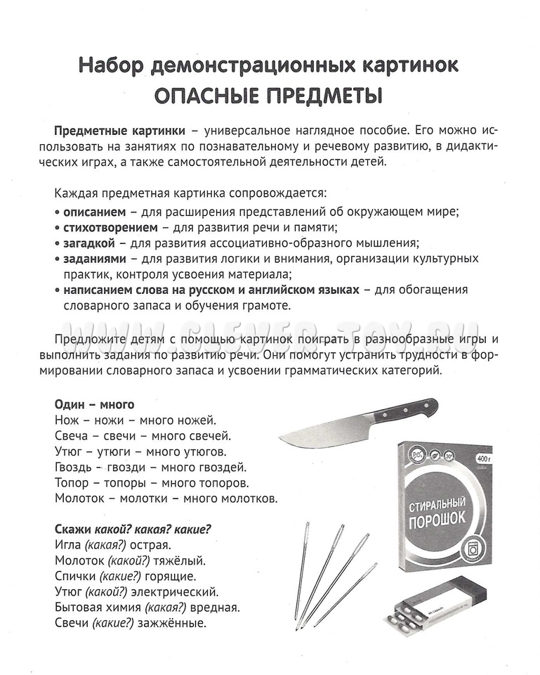 Комплект подходит для индивидуальной и групповой работы. Его можно использовать на тематических викторинах и вечерах, посвящённых правилам обращения с опасными предметами.