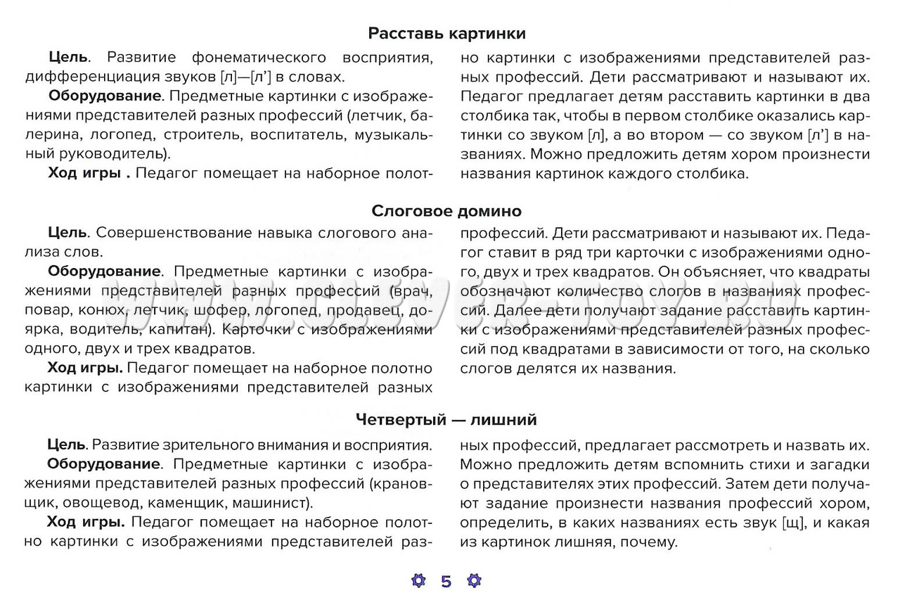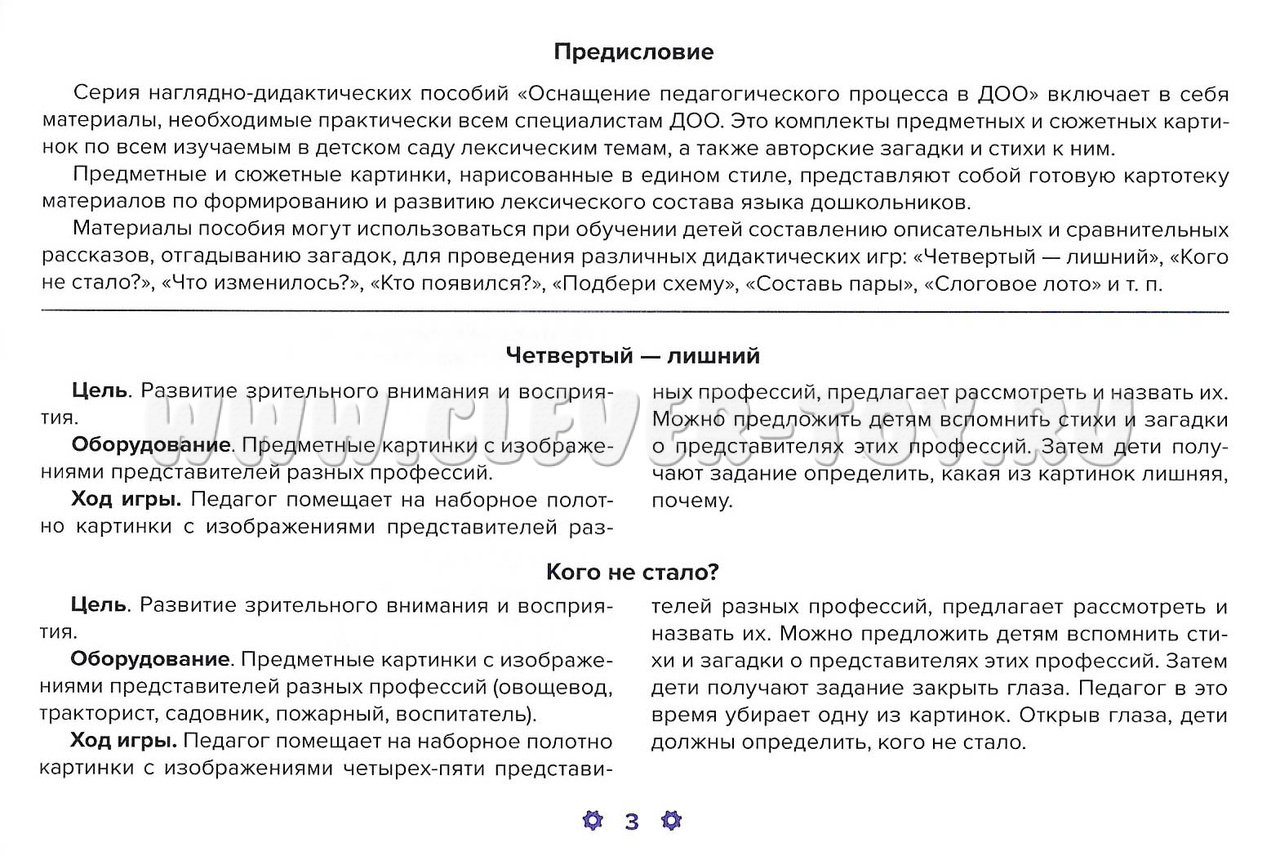 Пособие включает в себя наглядный дидактический материал для детей 5-7 лет, необходимый практически всем специалистам ДОО. Это комплект предметных картинок по лексической теме «Профессии», а также авторские загадки, стихи и дидактические игры с использованием материалов пособия.