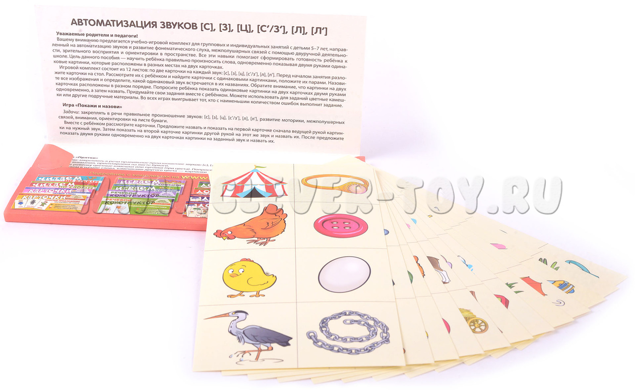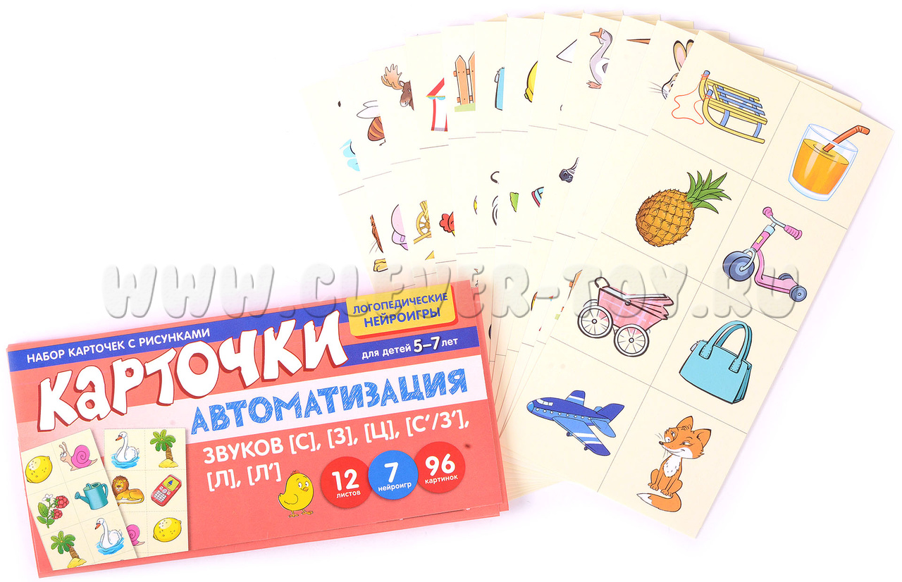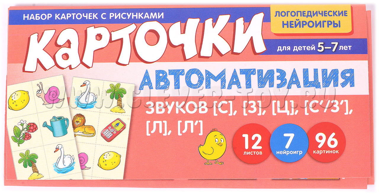 Учебно-игровой комплект "Автоматизация звуков [С], [З], [Ц], [С'/З'], [Л], [Л']" представляет собой 12 листов, состоящих из 96 картинок и 7 нейроигр, предназначен для детей 5-7 лет.