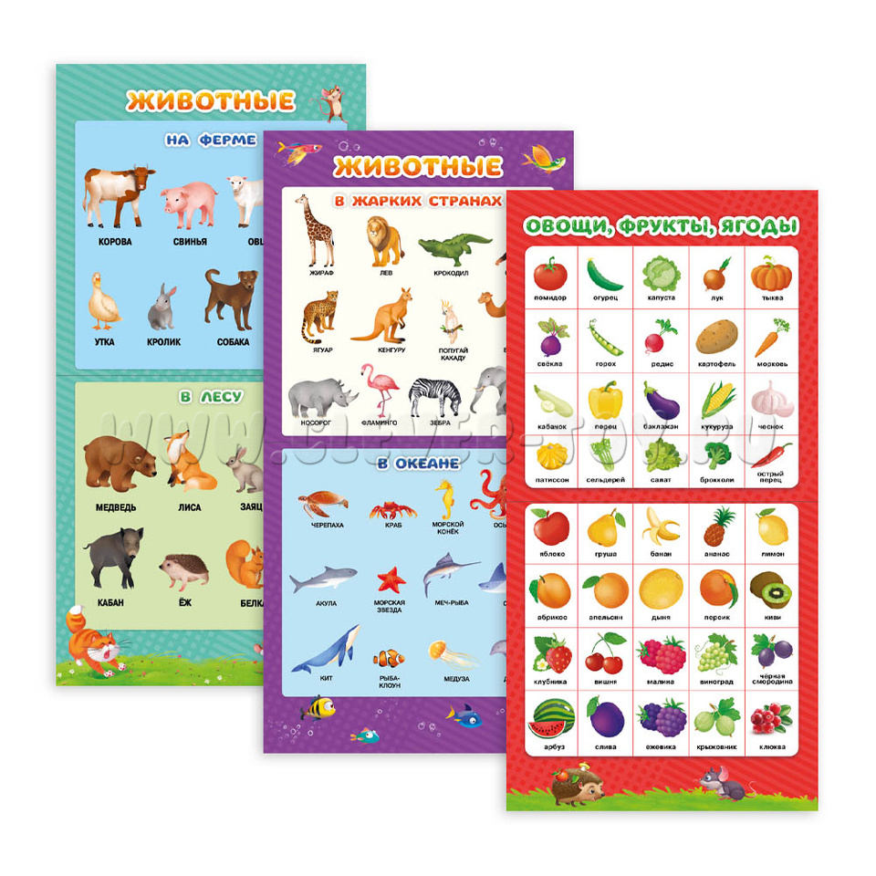 Сборник состоит из 9 обучающих плакатов, с помощью которых ребенок познакомится с буквами русского и английского алфавита, цифрами, животными, фруктами, овощами и ягодами, транспортом, профессиями и природными явлениями.