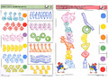 Задания настоящего комплекта предполагают последовательное знакомство ребёнка с принципом сохранения количества, который определяет независимость количества (числа) предметов от их расположения в пространстве, наличия либо отсутствия у них общих признаков (формы, величины, цвета, веса и т.д.). Ребёнок освоит приёмы оптимизации счёта: визуальный охват некоторого количества предметов; присчитывание к визуально узнаваемому количеству остальных предметов по единицам, двойкам, тройкам. Также уделяется внимание обучению вести прямой и обратный счёт, ориентироваться в отрезках натурального ряда чисел, узнавать и называть цифры. Примеры заданий в карточках: 2а. Найди одинаковые по количеству группы танцоров. 4б. Сравни две пирамиды мышат: что у них общего и чем они отличаются между собой? 5а. Клоун растерял вещи. Сколько каких? 7б. Назови числа на ступеньках лесенки и дорожке в прямом и обратном порядке. 8а. Сколько предметов появилось из шляпы в каждом облачке?