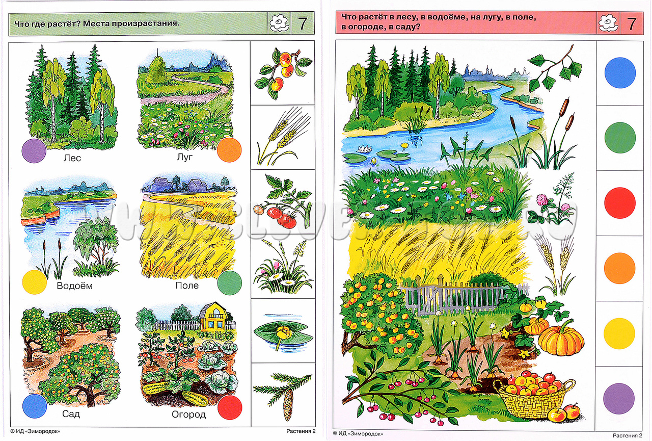 В процессе решения заданий ребёнок будет не только узнавать и называть новые и уже хорошо ему известные виды растений, но и называть их отдельные части, подбирать пары лист-плод и вершки-корешки, верно выстраивать этапы развития растений, искать различия и общие признаки у разных видов. Задания по теме равномерно распределены на два комплекта карточек Растения (1) и Растения (2), и не повторяются. Примеры заданий в карточках: 2б. Как растёт огурец: от семечка до семечка. 3б. Как можно назвать растения в каждом ряду одним словом? 4б. Чем и как питаются животные? 5а. Из каких растений изготовлены эти продукты питания? 7б. Что растёт в лесу, в водоёме, на лугу, в поле, в огороде, в саду?