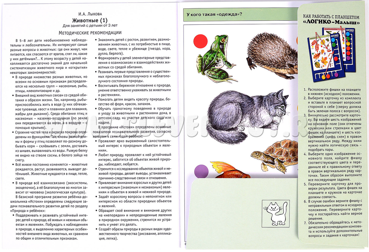 Основное назначение комплекта – ознакомление ребёнка с разнообразным миром животных. В процессе решения заданий, ребенок будет не только узнавать и называть новых и хорошо ему известных представителей животного мира, но и подбирать для них жилища, «одежду», питание, среду обитания, следы. Кроме того он будет определять к какой группе относятся те или иные представители животных (млекопитающие или звери, птицы, насекомые, рыбы, пресмыкающиеся и др.), опираясь в своем выборе на общие признаки отдельных видов. Другие темы карточек: пары взрослых животных и их детенышей; этапы развития; способы передвижения; взаимодействие с человеком. Задания по теме равномерно распределены на два комплекта карточек Животные (1) и Животные (2) и не повторяются. Примеры заданий в карточках: 1б. Чем покрыто тело этих животных? У кого перья, шерсть, иголки, чешуя, кожа, панцирь? 3а. Кто оставил следы на снегу? 4а. Где чьё жилище? 6а. Какой этап в развитии животных пропущен? 7б. Где домашние, а где дикие животные (птицы)?