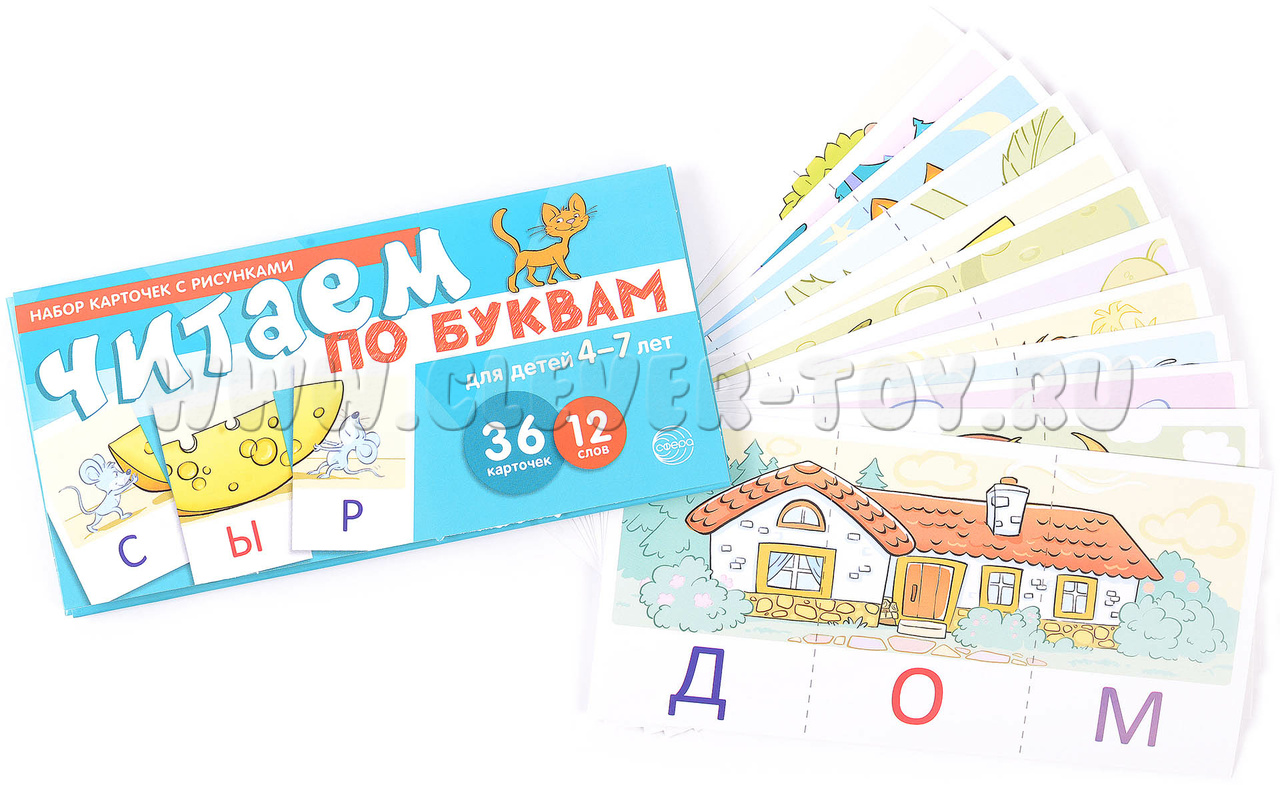Издание, предназначенное для обучения детей 4-7 лет чтению, представляет собой комплект из 12 обучающих картинок, включающих 36 карточек и 12 слов.