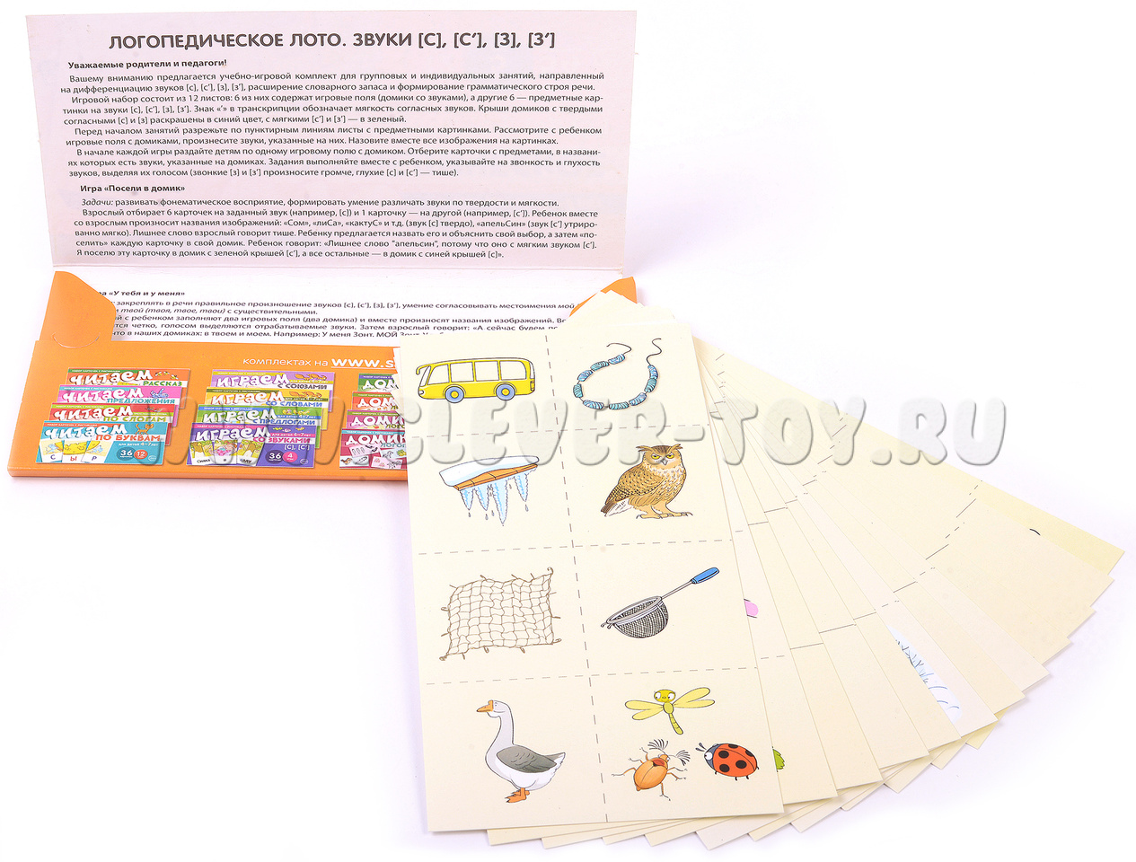 Комплект "Логопедическое лото. Учим звуки [С] [С’] [З] [З’]" состоит из 12 листов с 54 карточками и 5 игр. Дети в интерактивной форме учатся различать твердые и мягкие звуки, правильно их произносить и описывать картинки с помощью заданных слов. Пособие предназначено для педагогов и родителей, подходит для индивидуальных и групповых занятий.
