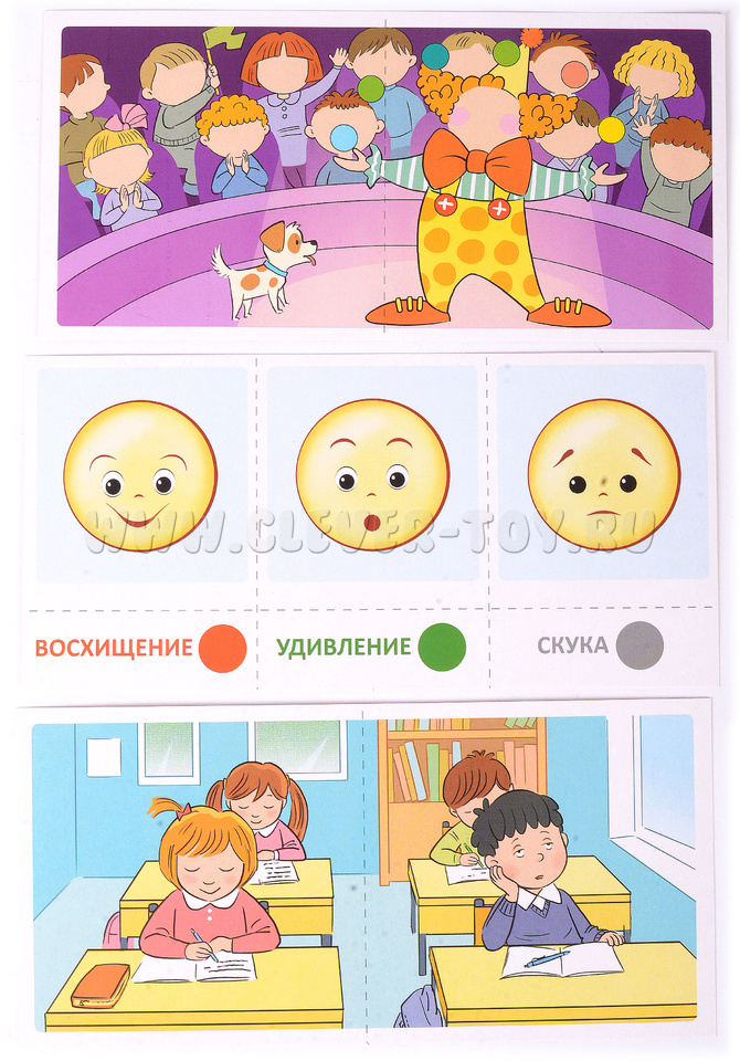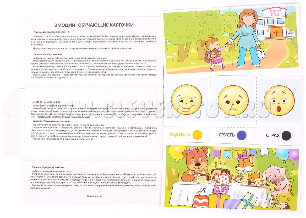 Комплект предназначен для детей от 4 до 7 лет и помогает им лучше понять различные эмоциональные состояния человека. Кроме того, он способствует развитию коммуникативных навыков и правильному звукопроизношению. В игровой форме ребенок научится распознавать, называть и описывать эмоции.