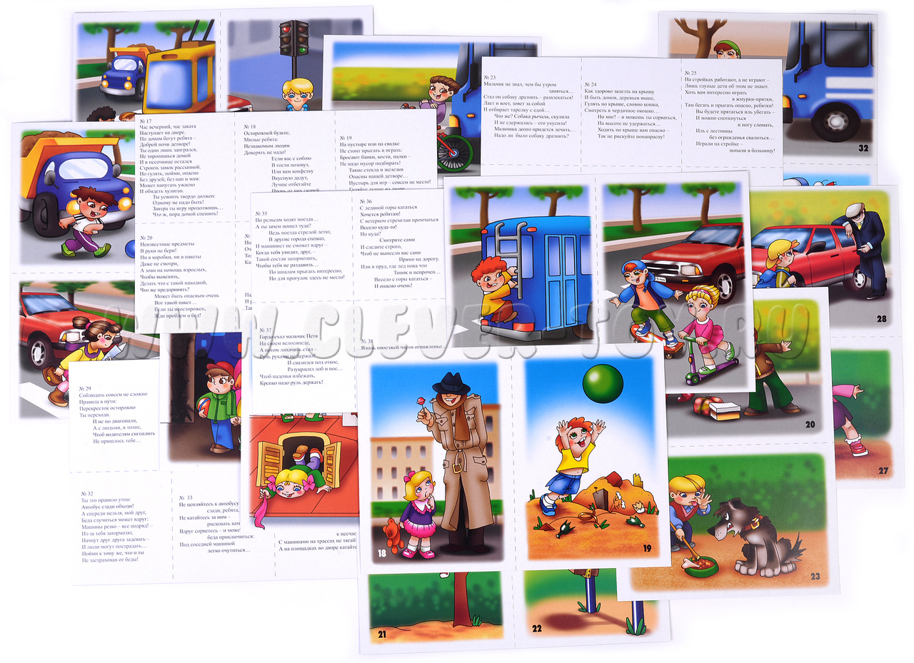 - Раздайте детям поровну картинки-иллюстрации. Начните зачитывать стихотворения. Игрок, чья картинка соответствует содержанию стихотворения, забирает карточку с ним себе и объясняет, как избежать опасной ситуации и выйти из нее, если ситуация все же случилась;