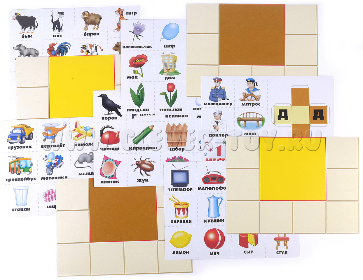 1. Игроки берут по большой карте, определяем, на какую часть слова будем ориентироваться. Ведущий показывает по одной картинке, а дети выбирают нужные. Первый, кто заполнит карту, побеждает.