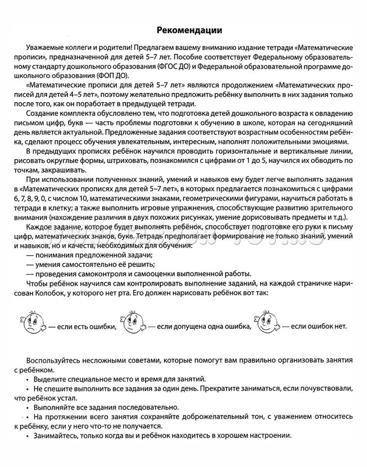 При проведении самоконтроля давайте ребёнку чёткие критерии правильно выполненного задания (например, ты должен был обвести цифру 5), сверяясь с которыми, он самостоятельно оценивает свою работу. С этой целью на каждой страничке нарисован Колобок-смайлик, у которого не обозначен ротик (эмоция), его должен изобразить ребёнок, оценивая свою работу.