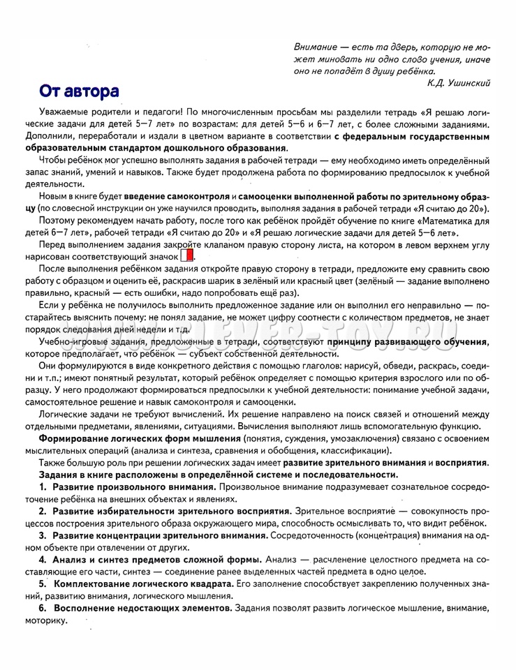 Логические задачи в тетради не требуют вычислений и направлены на поиск связей и отношений между различными предметами, явлениями и ситуациями. Формирование логических форм мышления (понятий, суждений, умозаключений) связано с освоением мыслительных операций (анализа, синтеза, сравнения, обобщения и классификации). Развитие зрительного внимания и восприятия также играет важную роль в решении логических задач.