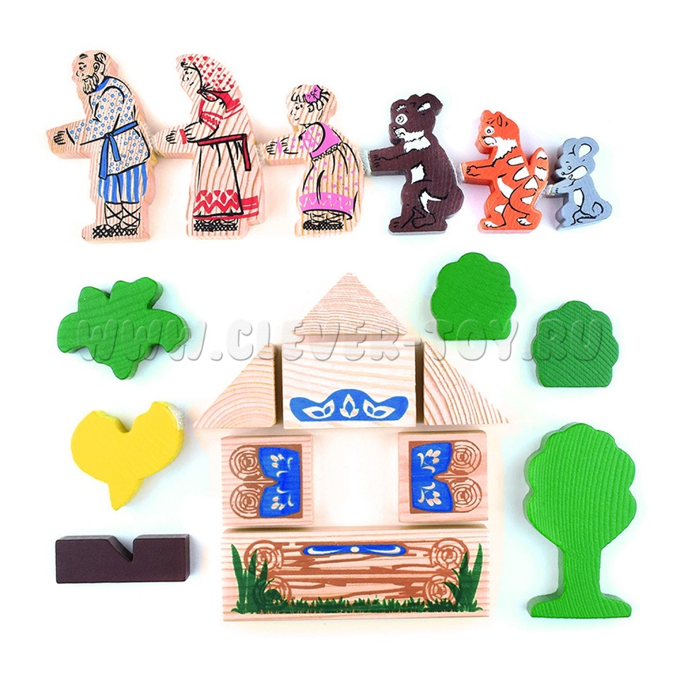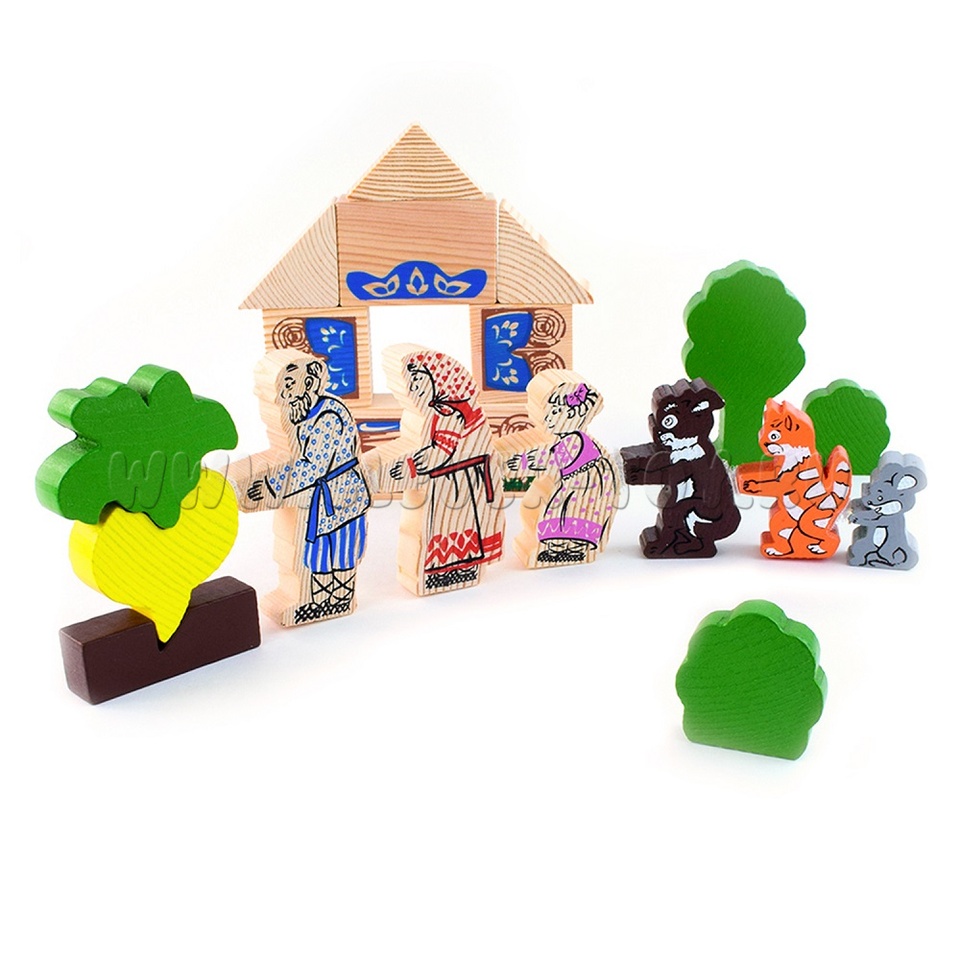 В набор входят деревянные модели персонажей и декорации сказки "Репка" (19 деталей), а также вкладыш с текстом сказки.