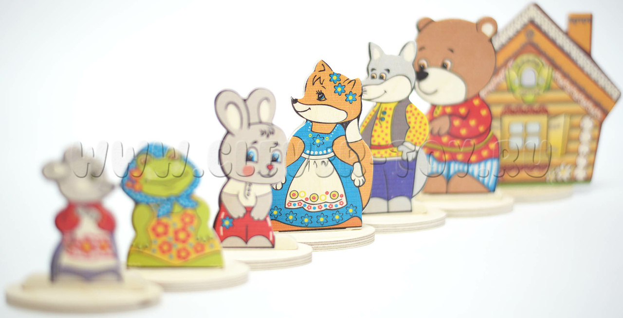 - 7 сказочных персонажей на подставках(заяц, мышка,лягушка, медведь, волк, лиса, теремок) от 6,5 до 12 см.;