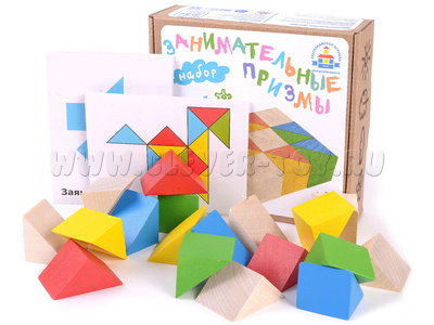 Деревянный конструктор "Занимательные призмы" для самостоятельной сборки ребенком разноцветных фигур по образцам на карточках-заданиях, либо используя воображение.