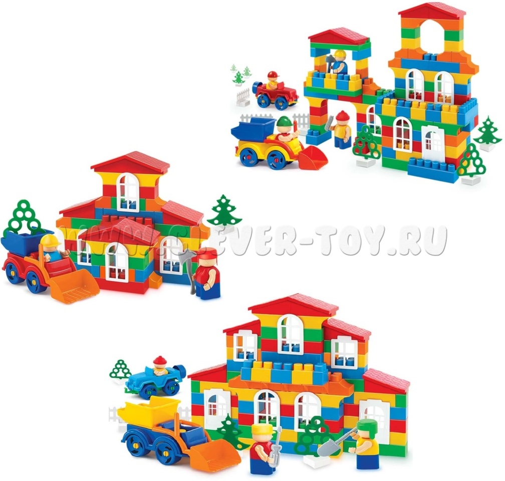 В составе: блоки разного размера, человекоподобные фигурки, инструменты, сборочные модели машин, элементы декорирования (заборы, растения, окна, дверные проемы, крыши). Детали подходят для соединения с другими комплектами от BAUER.