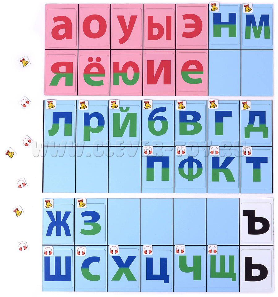 В комплект входят 33 магнитные карточки с буквами размером 6 см на 8 см, а также карточки с колокольчиками и наушниками. Размер доски в собранном виде составляет 140 см на 19 см.