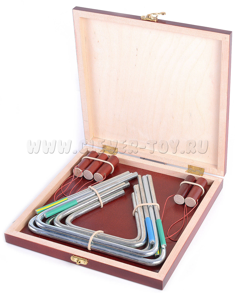 Треугольники выполнены из стали диаметром 8мм. Гальваническое покрытие не ухудшает качество звука и не разрушается при механическом воздействии. Подарочный кейс с золочеными застежками.
