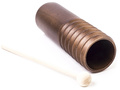Погремушка представляет собой деревянный цилиндр диаметром 50 мм и высотой 120 мм. Внутри находится полый стакан с охотничьей дробью. Цилиндр с внутренней стороны гладкий, снаружи - ребристый. Канавки под углом 90 градусов выполнены токарным способом. Музыкальный инструмент комплектуется ударной палочкой с шариком на конце. Материал: липа.