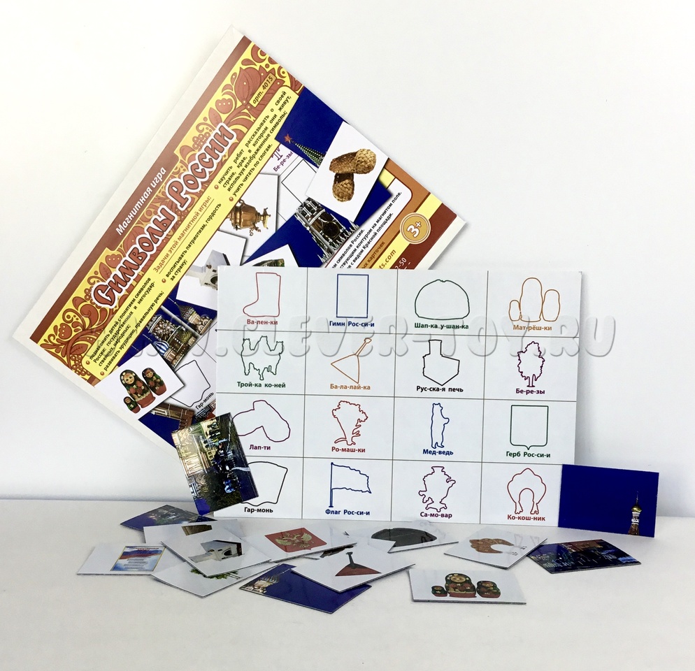 Что узнает ребёнок: В игре собраны символы России. Государственные: флаг, герб, гимн. Негосударственные: берёзы, гармонь, тройка лошадей, матрёшки и другие.