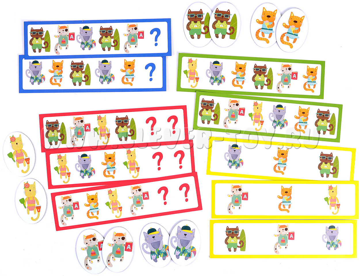 2. Игра для поля с шезлонгами (обратная сторона игрового поля). Начинайте с заданий в зеленой рамке: воспроизводите заданную карточкой последовательность котят. Более сложные задания предлагают не только продолжить ряд, но и установить взаимосвязь и закончить последовательность самостоятельно. К этим заданиям стоит переходить, когда малыш уверенно справляется с зелеными карточками.