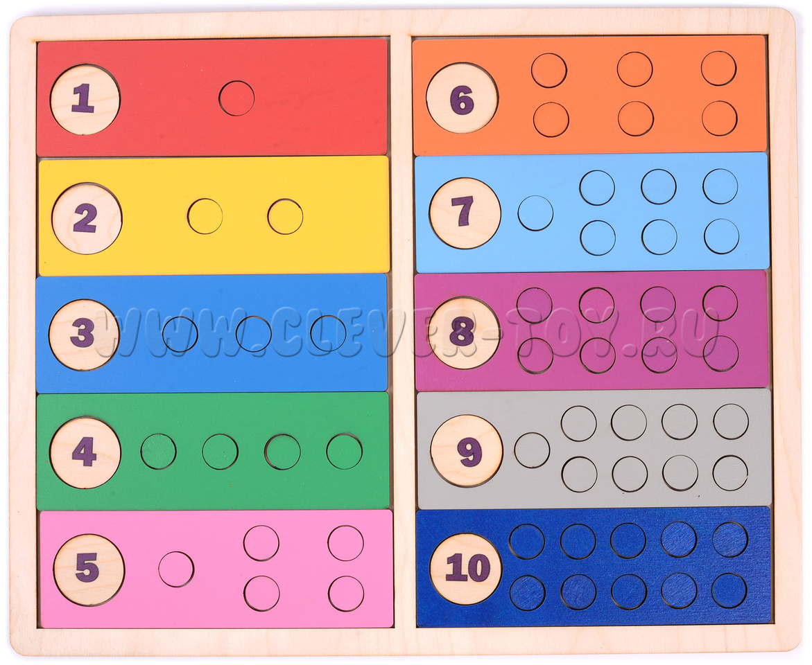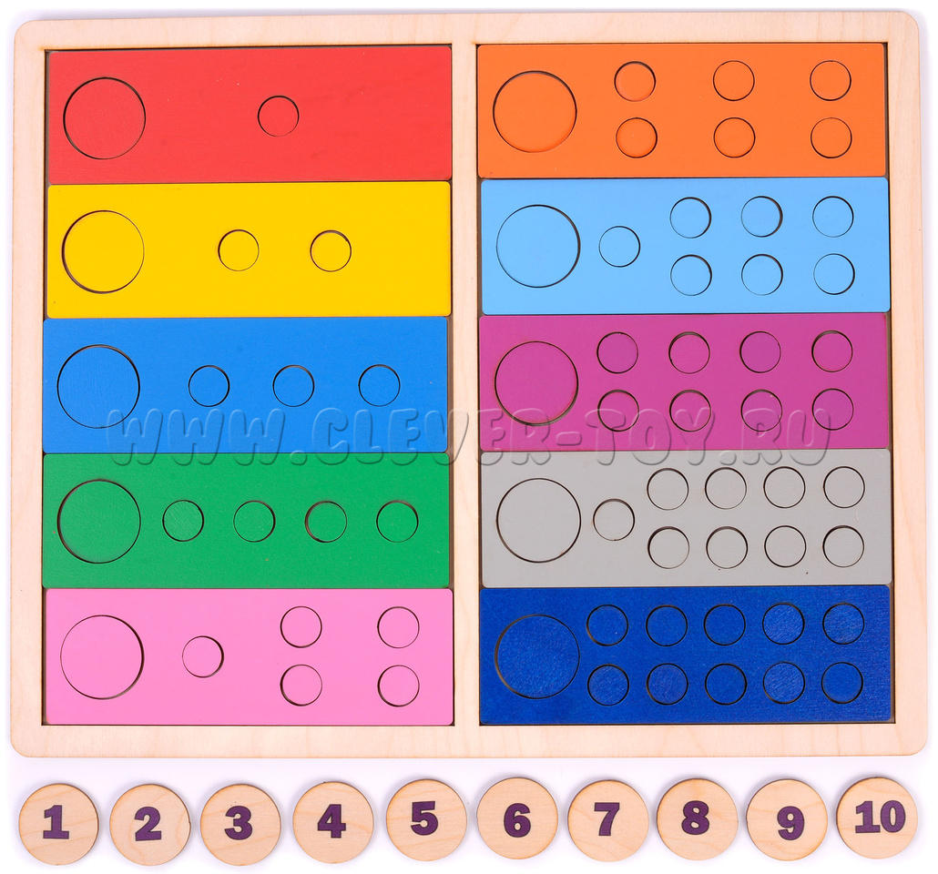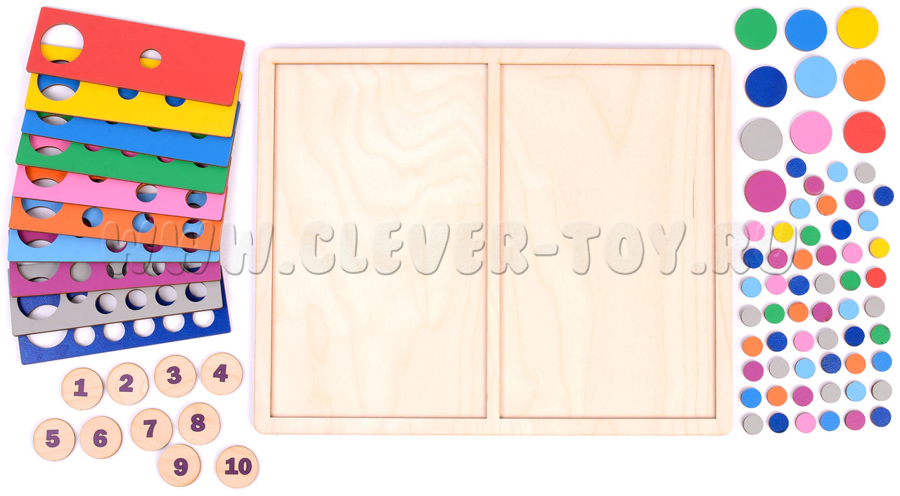 1. Сортируйте кружки по цветам, вкладывайте их в отверстия с учетом цвета дощечки;