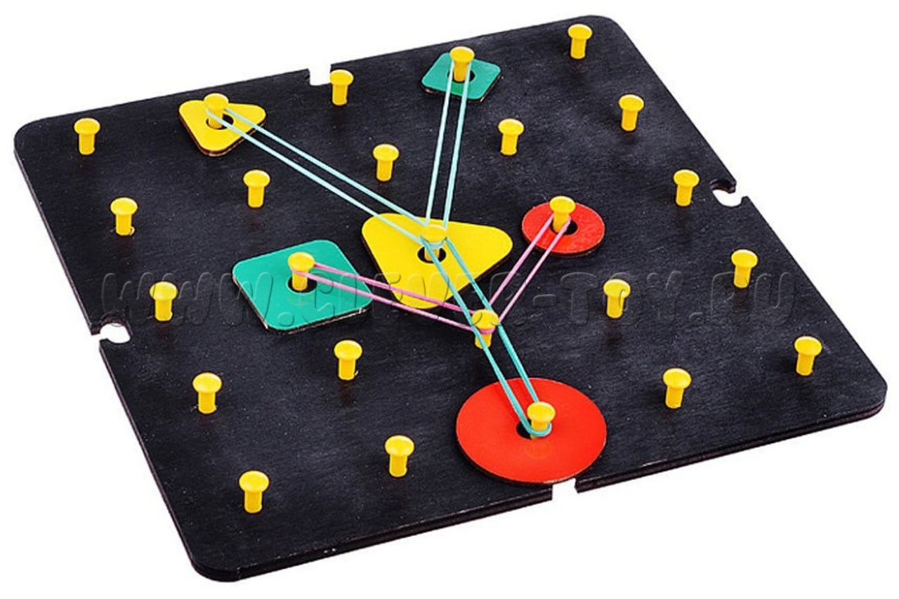 Благодаря математическому планшету у ребенка появляется возможность рисовать и конструировать с помощью игрового поля и резиночек на нем.