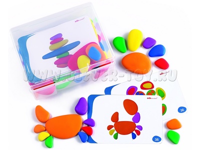 Набор состоит из 36 цветных камешков и 20 двусторонних карточек, в которых приведены примеры заданий.