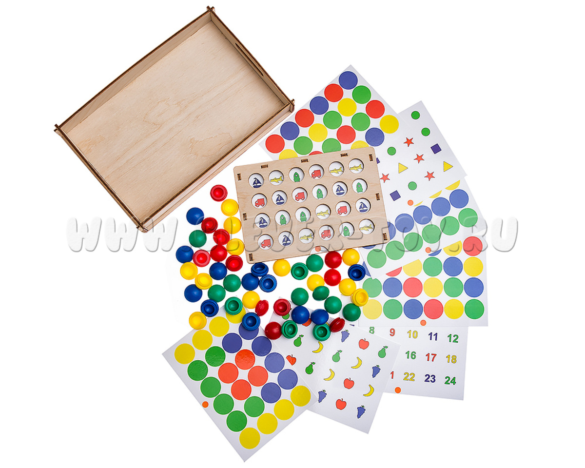 6 вариантов игры! Размер планшета: 11*16 см. Состав набора: деревянный планшет - 1 шт; пластмассовые фишки - 32 шт; ламинированные карточки - 8 шт.