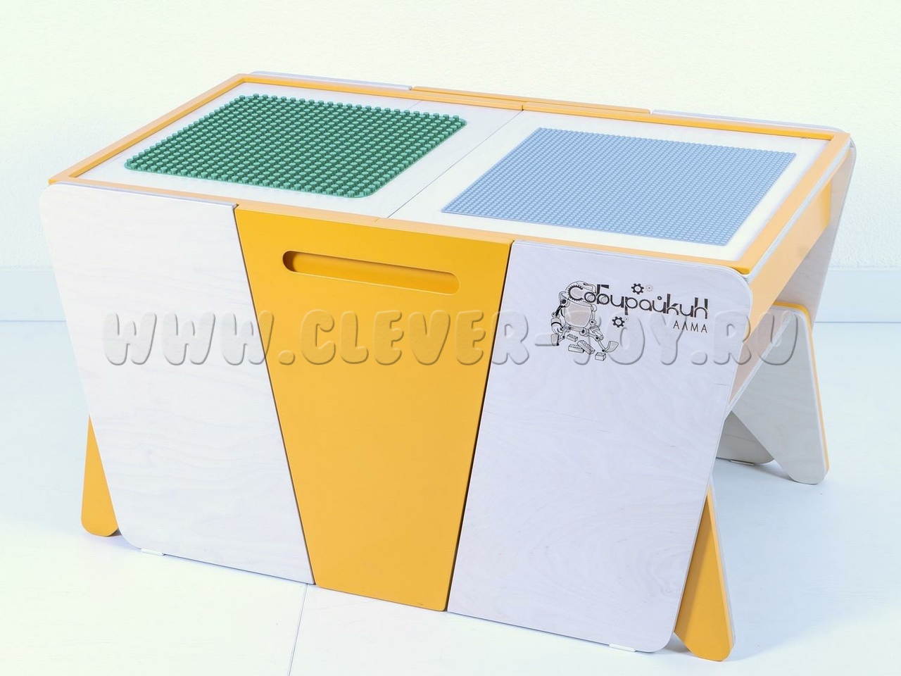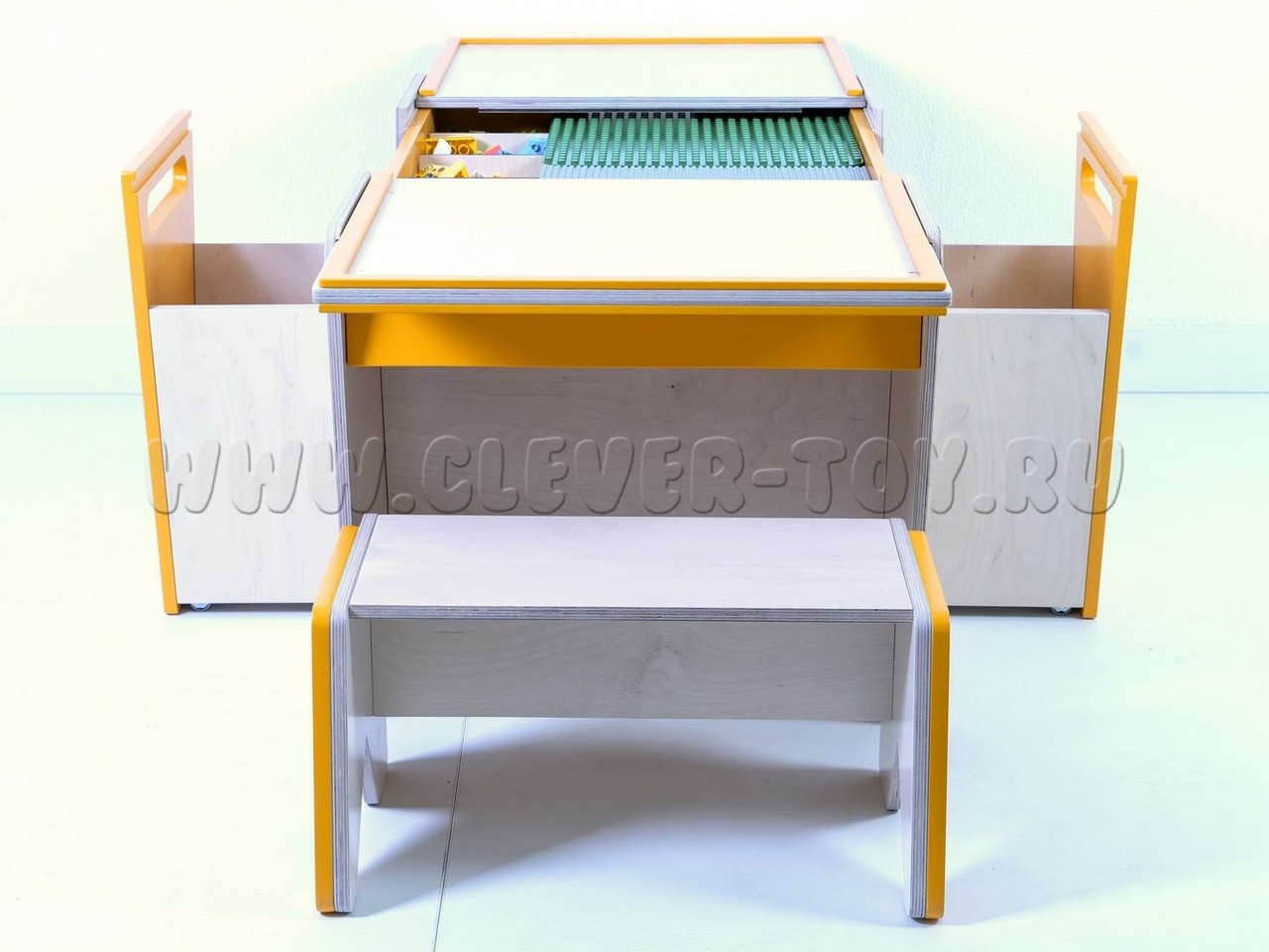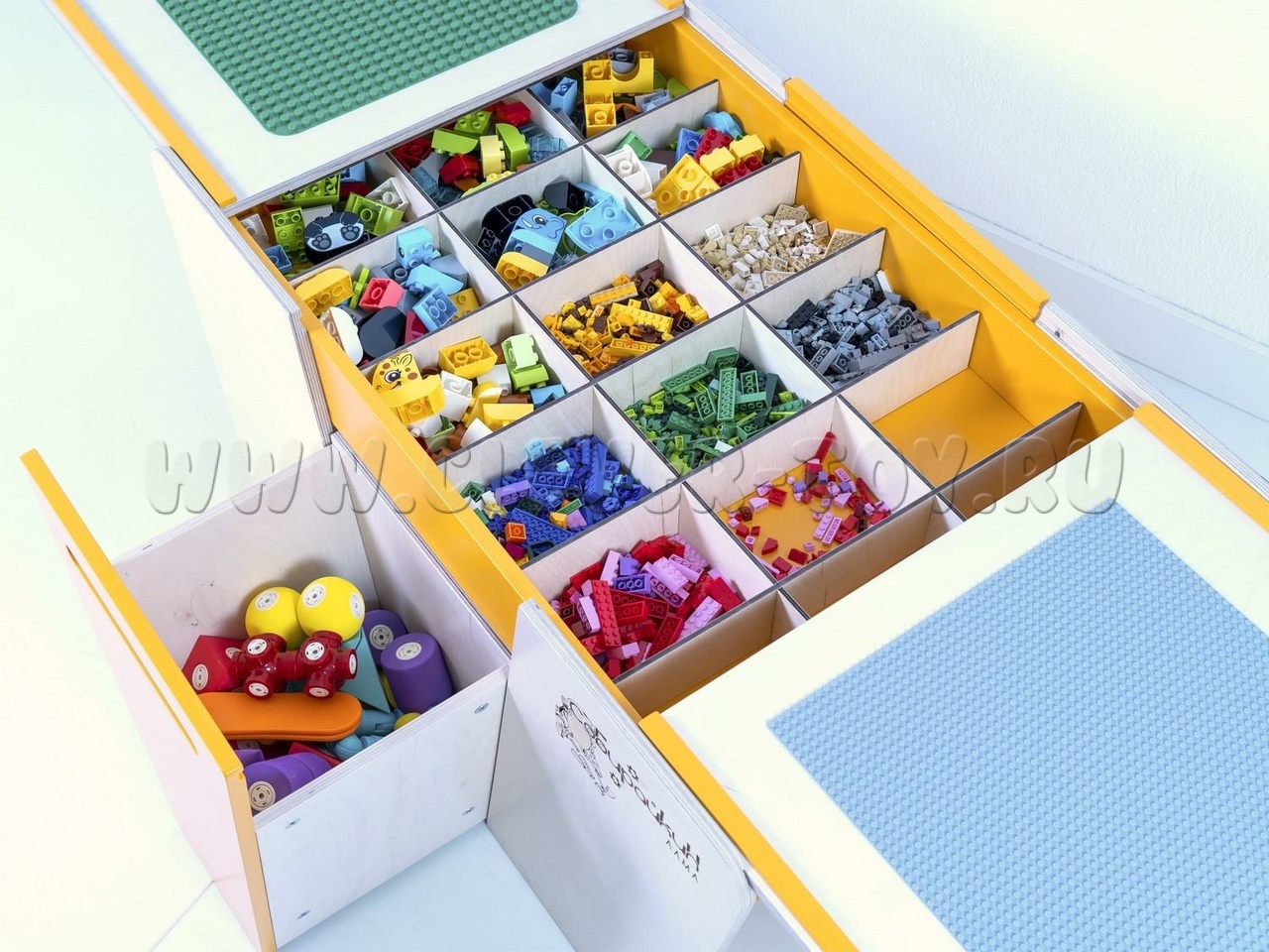 Рабочая поверхность разделена на две зоны, а под раздвижными столешницами есть пластины для сборки конструкторов Lego Duplo и Classic. Система хранения вмещает более 1200 деталей этих конструкторов