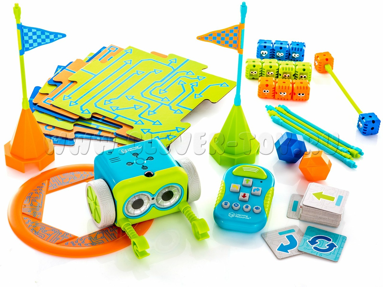 - различные аксессуары для создания препятствий на пути робота: 8 палочек, 12 кубов, 2 конуса, 2 флажка, 2 мяча и ворота;