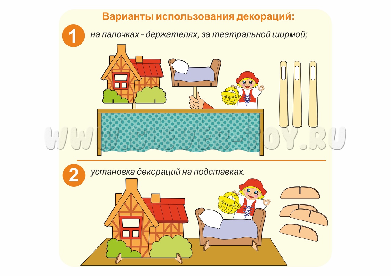 1. Игра "В гостях у сказки". Рассмотрите все предметы игрового набора вместе с ребенком. Объясните, для чего нужны декорации, ширма, сцена. Попросите назвать знакомых героев, уточните название сказки. Обсудите с ребенком, что такое спектакль, что в кукольном театре делают актеры, зрители. Уточните, почему спектакль называется кукольным. Расскажите, кто такой кукловод. Предложите установить декорации на подставки и подготовить куклы-перчатки для спектакля.